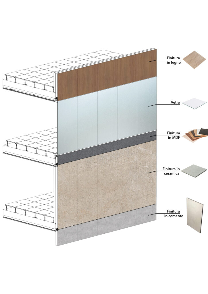Le superfici esterne dei pannelli modulari possono essere personalizzate per adattarsi a qualsiasi progetto architettonico, offrendo un vasta gamma di finiture, per soddisfare le esigenze estetiche e funzionali.